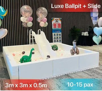 Step into a world of whimsical wonder and pure luxury with our exclusive Luxe White Ballpit! Complete with a long wavy slide that promises endless fun and an inviting pool filled with loads of pit balls, it's the picture-perfect addition that will leave your guests awe-struck!