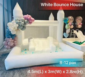 Look no further than the stunning white bouncy house, complete with a ball pit and slide! This incredible addition will not only amaze your guests but also create unforgettable memories for all. And that's not all – imagine adding a mesmerizing balloon garland, transforming this already magnificent setup into an absolute showstopper.